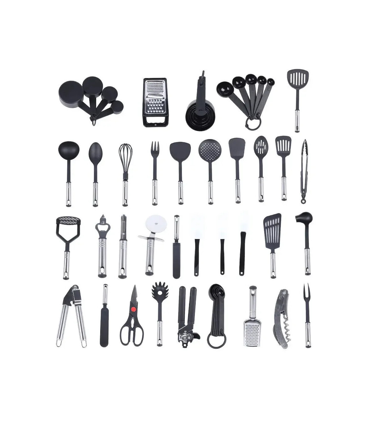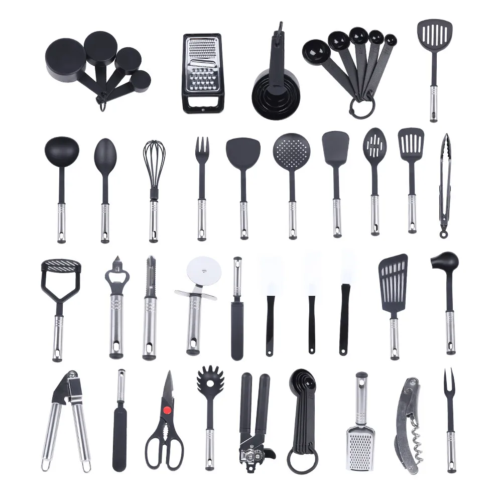 Assistant de cuisine :Cet ensemble comprend un total de 40 types différents d'ustensiles de cuisine, dont une louche à soupe, des fourchettes, des spatules, un batteur à œufs, un ouvre-boîte, 1 paire de ciseaux, un broyeur à gingembre, un presse-ail, des cuillères à mesurer, des tasses à mesurer et plus encore, qui peut vous aider à gérer facilement diverses tâches de cuisine, qu'il s'agisse de mélanger, de peler, de mesurer des ingrédients ou d'ouvrir des bouchons