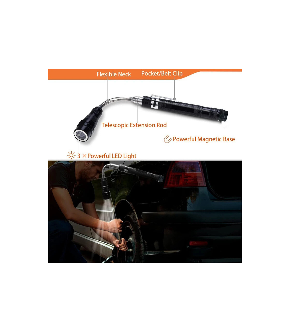 3. Super bright flashlight: features three super bright LED bulbs; magnetic head and base; 360° swivel neck; extended stainless steel pocket clip; helps illuminate and grasp tools in dark and narrow places.