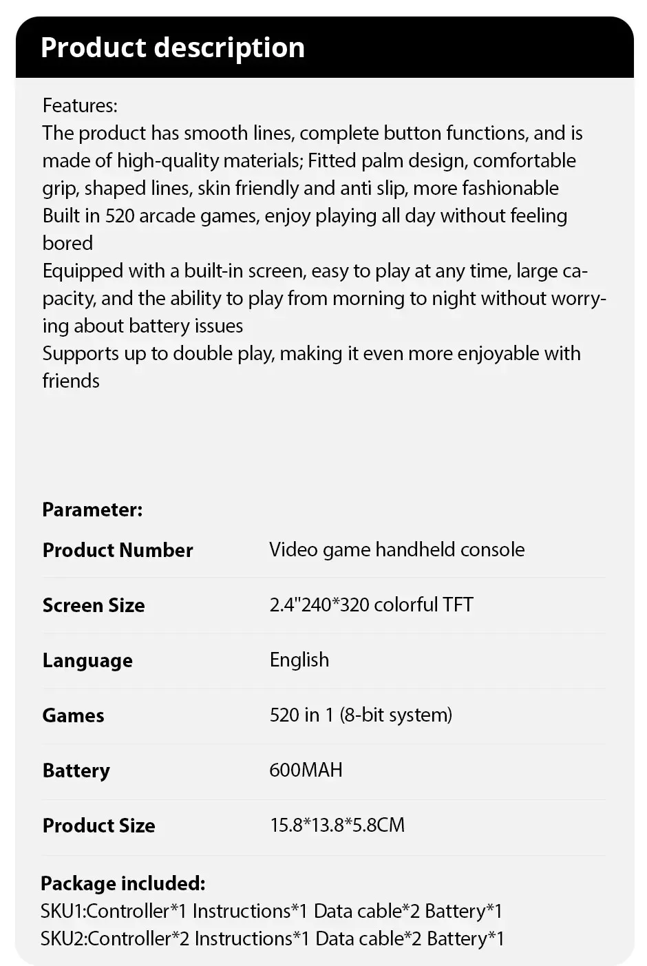 • 520 built-in games:Enjoy a vast library of games with 520 built-in games, offering hours of endless entertainment.