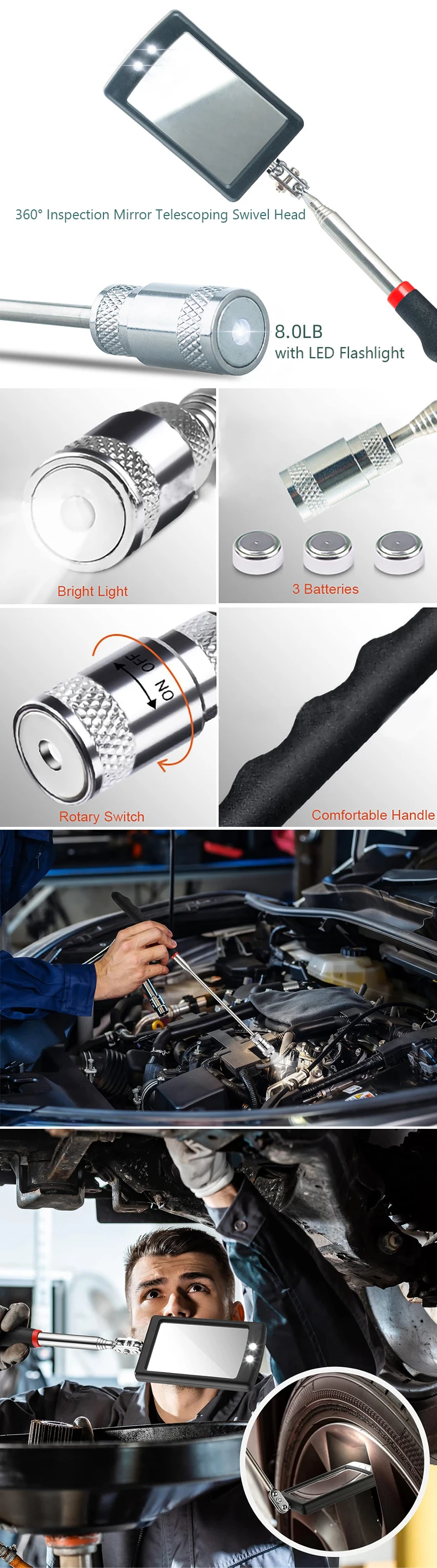 4.360° Rétroviseurs d'inspection ronds et carrés rotatifs : miroirs en verre de qualité supérieure pour une réflexion parfaite ; la rotule entièrement inclinée contient des miroirs pour 360°° visualisation libre sans balancer ; le miroir carré comprend des lumières LED pour faciliter les inspections dans les zones sombres.