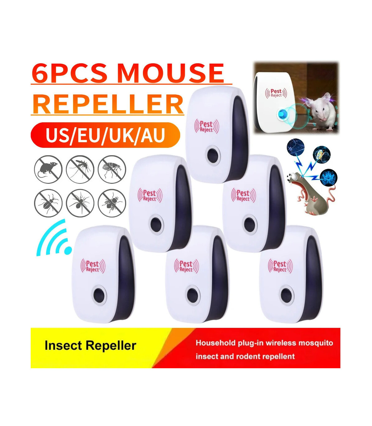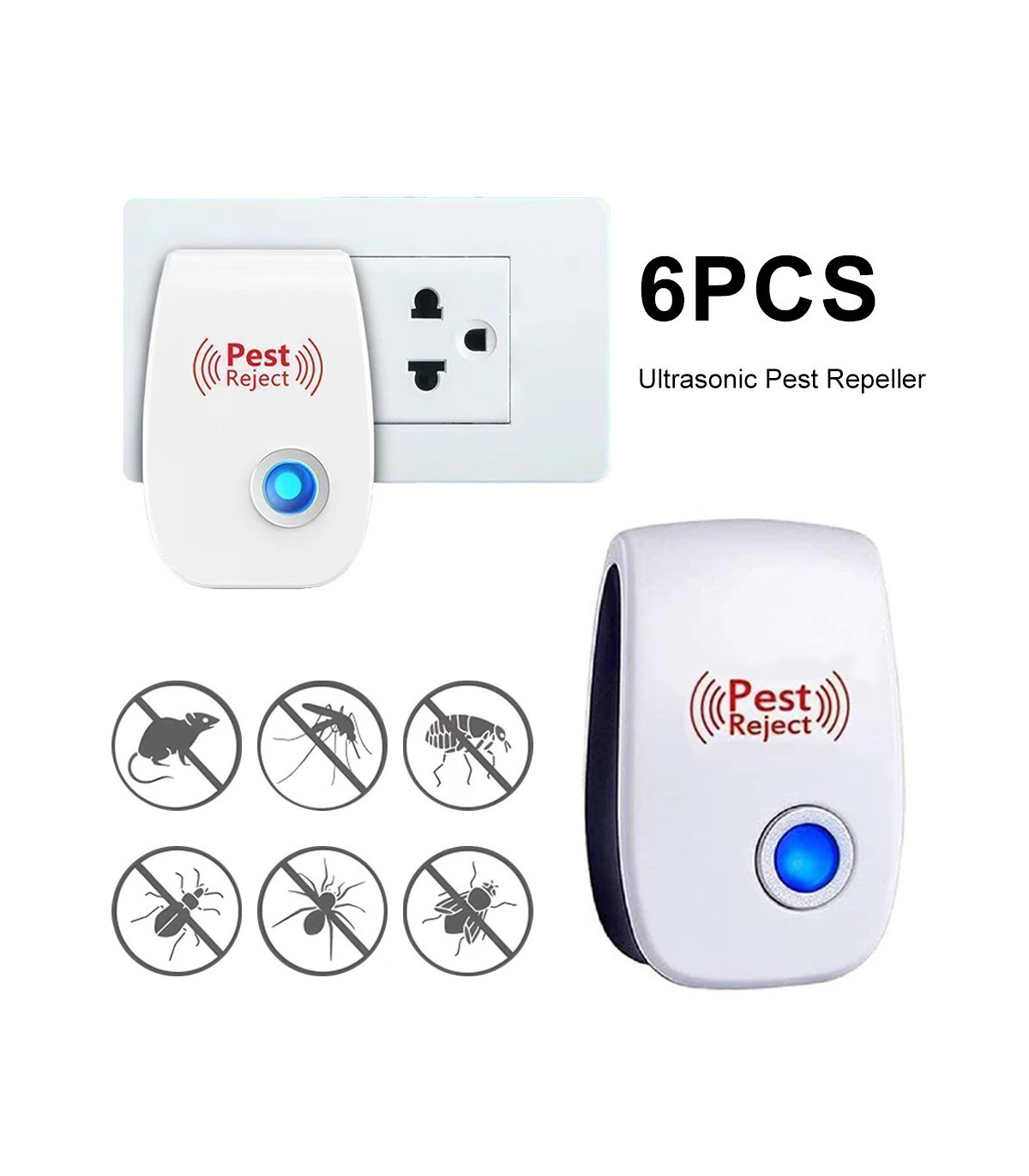 Répulsif ultrasonique antiparasitaire, 6 pièces, répulsif anti-insectes à longue portée, dissuasif antiparasitaire et anti-insectes, multifonction pour rocher, rongeur, souris, Bugs Caractéristiques : 1.Technologie ultrasonique puissante :Cet ensemble de six répulsifs ultrasoniques émet des ondes sonores à haute fréquence pour chasser efficacement les insectes, les rongeurs et autres parasites.