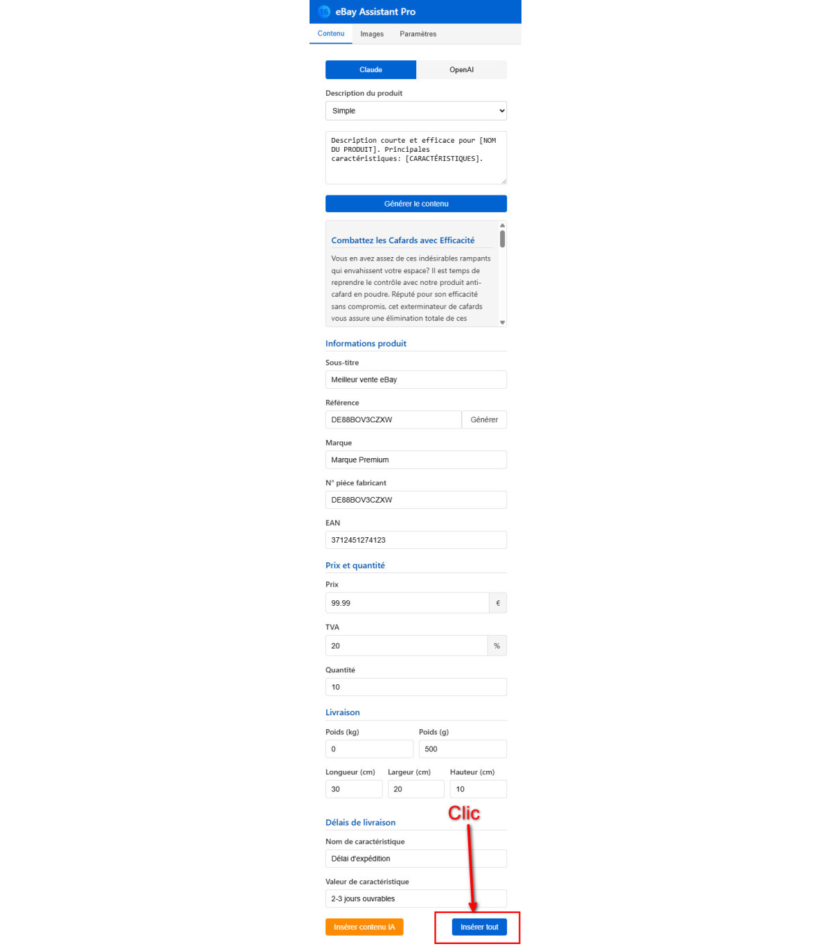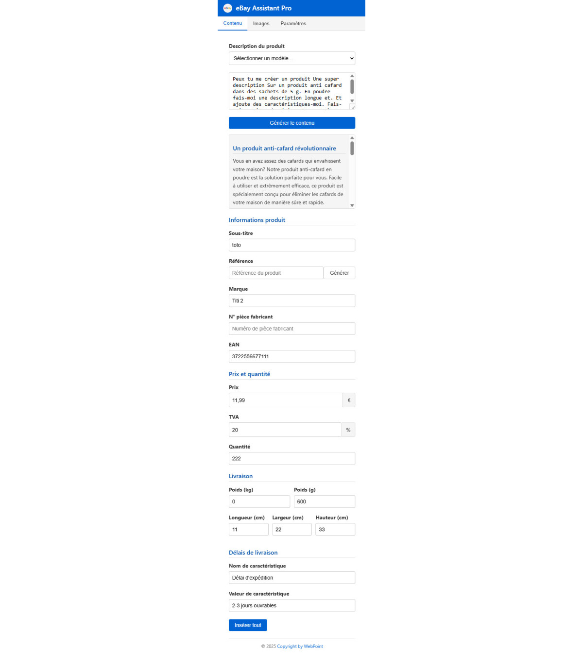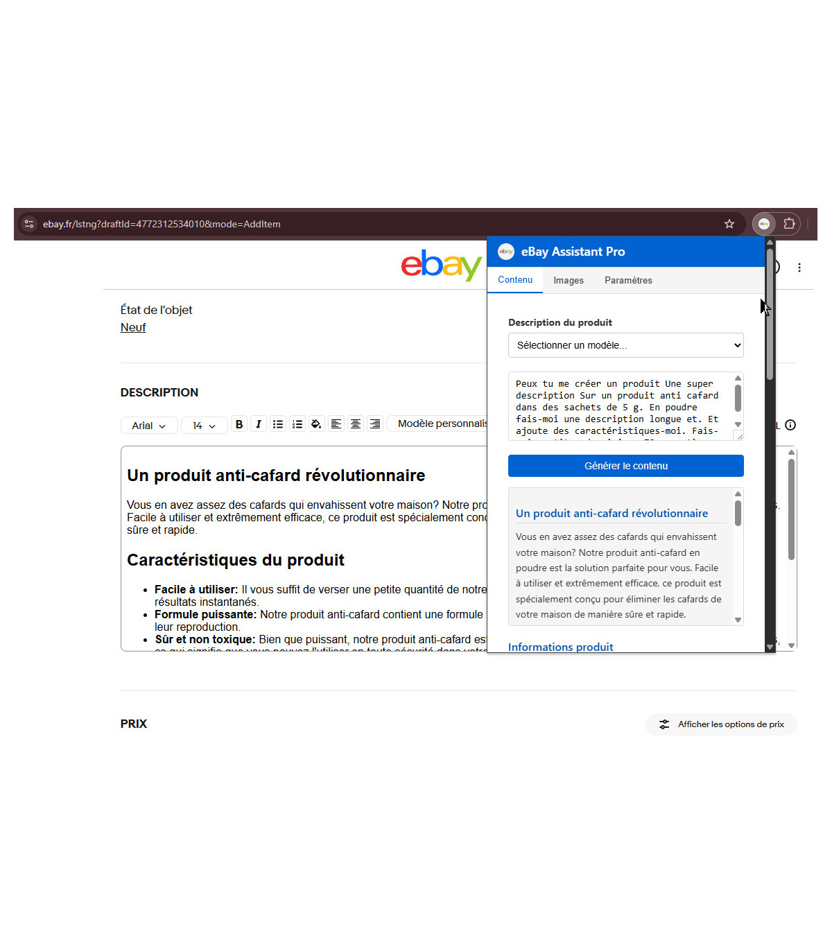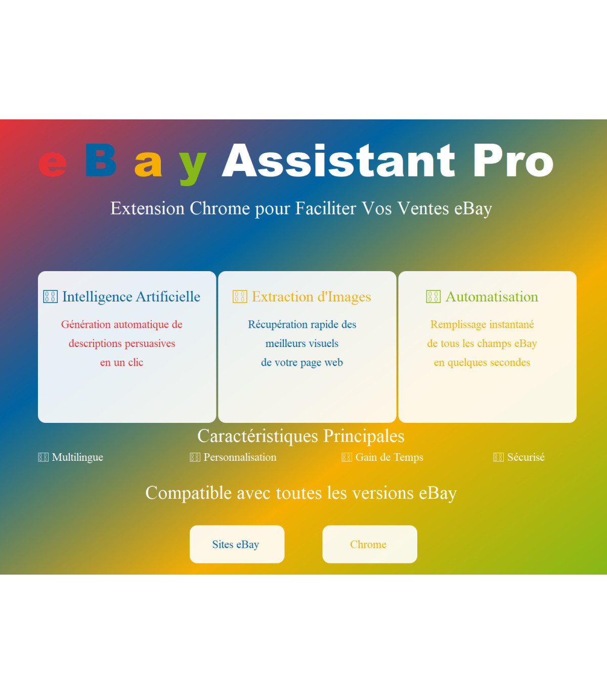 Lire la suite✨ eBay Assistant Pro è molto più di una semplice estensione per Chrome: è il tuo assistente intelligente dedicato alla creazione di inserzioni eBay che massimizzano il tuo potenziale di vendita .