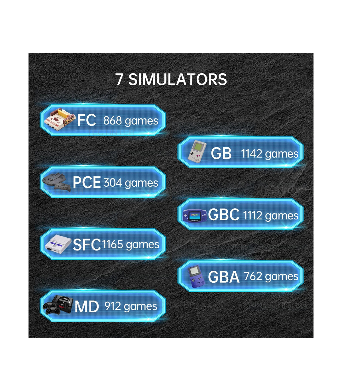 Questa console di gioco portatile supporta GB/GBA/GBC/FC/SFC/MD/PCE che coprono molti tipi di giochi, come avventura, azione, corsa, ecc. 6000 + giochi sono pre-installati. I giocatori possono seguire i tutorial video forniti da noi e giocare ai giochi da soli.