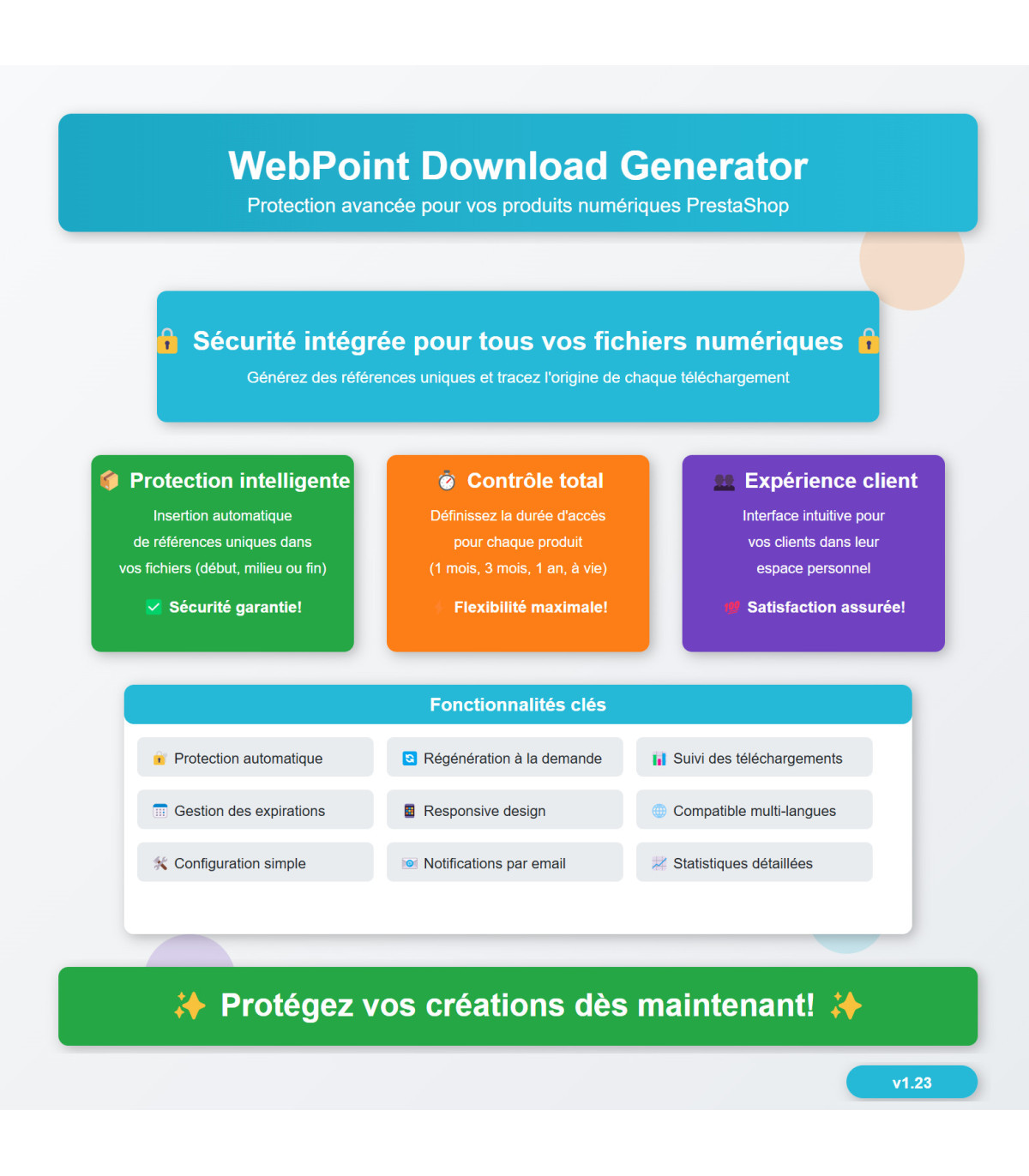Non lasciare che le tue creazioni digitali circolino liberamente senza protezione! WebPoint Download Generator è la soluzione professionale che stavi aspettando per proteggere efficacemente tutti i tuoi prodotti scaricabili nel tuo negozio PrestaShop.
