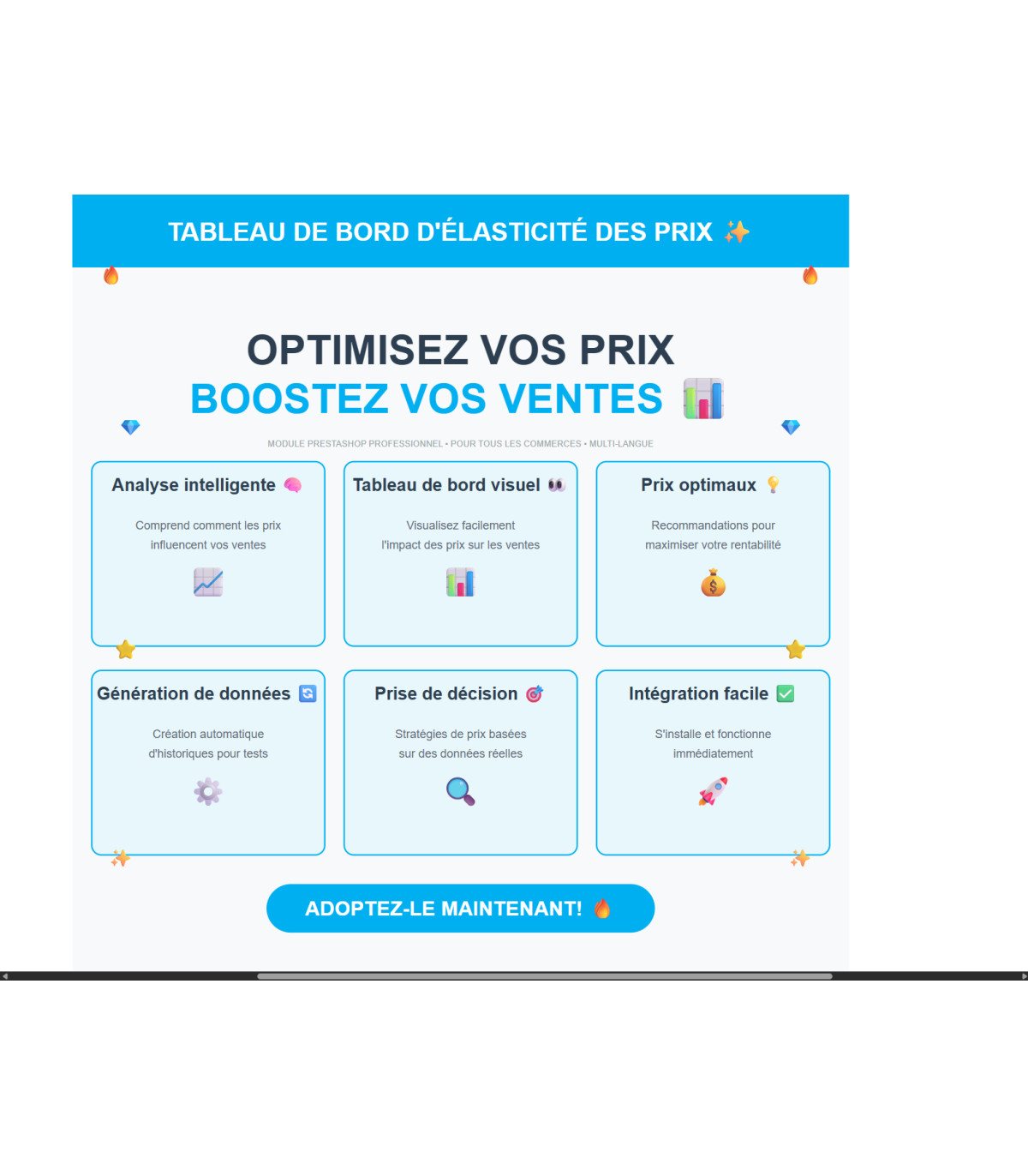 Lire la suiteRivoluziona la tua strategia di prezzo con un modulo di analisi dell'elasticità dei prezzi intelligente e accurato. Trasforma i tuoi dati in concrete opportunità di business. Una soluzione PrestaShop rivoluzionaria per ambiziosi imprenditori dell'e-commerce.