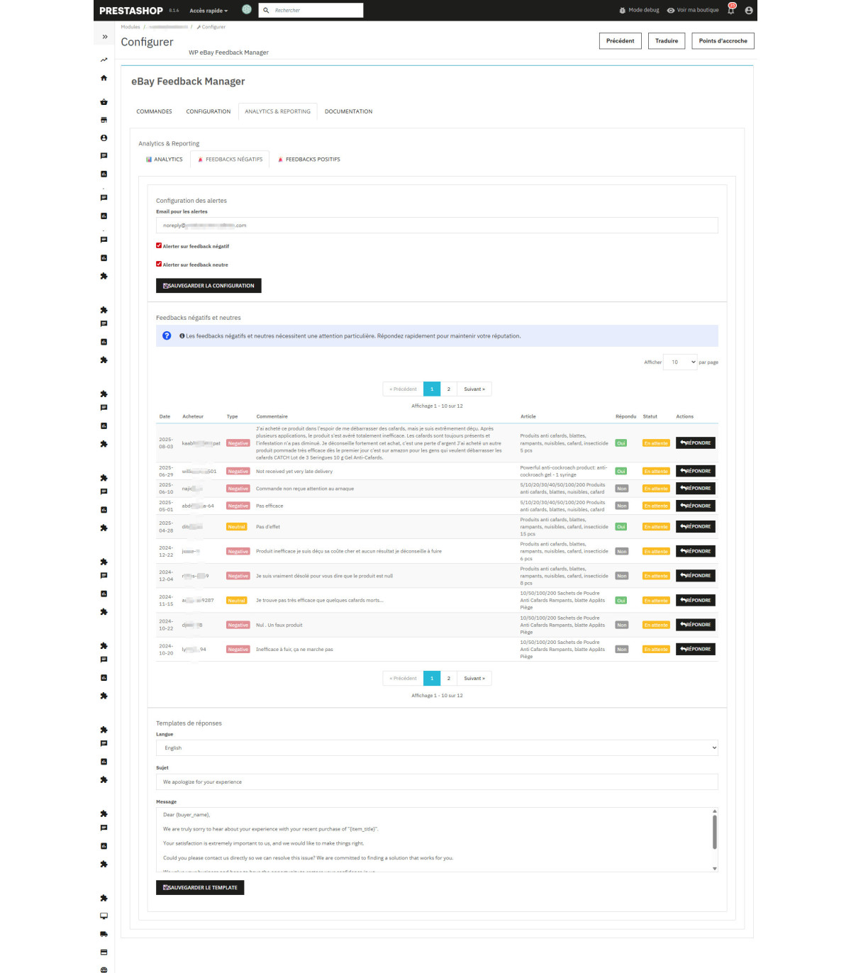 Il nostro sistema rileva istantaneamente feedback negativi e neutri. Riceverai un avviso via email immediato per rispondere rapidamente e proteggere la tua reputazione . Interfaccia dedicata con modelli di risposta predefiniti per risparmiare tempo.