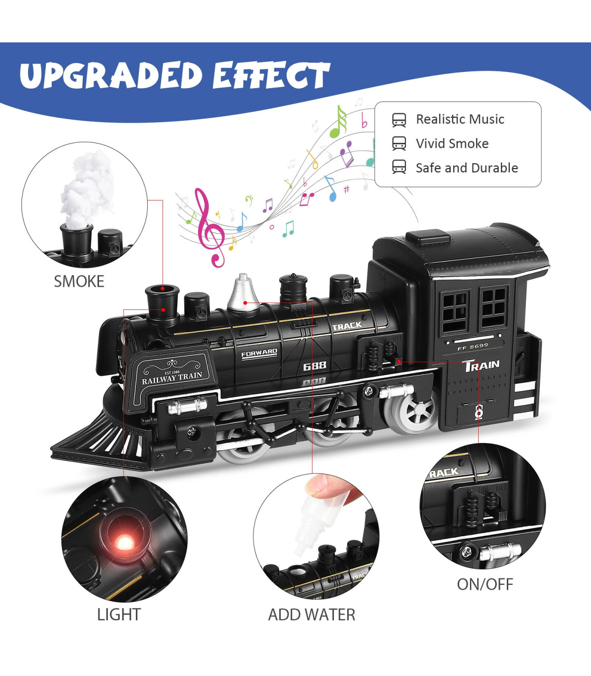 - La locomotiva simulata a vapore, compresi i vagoni e i binari, può offrirti effetti realistici come fumo e luce, suono, può aiutare i bambini più piccoli a scoprire le conoscenze sui treni.